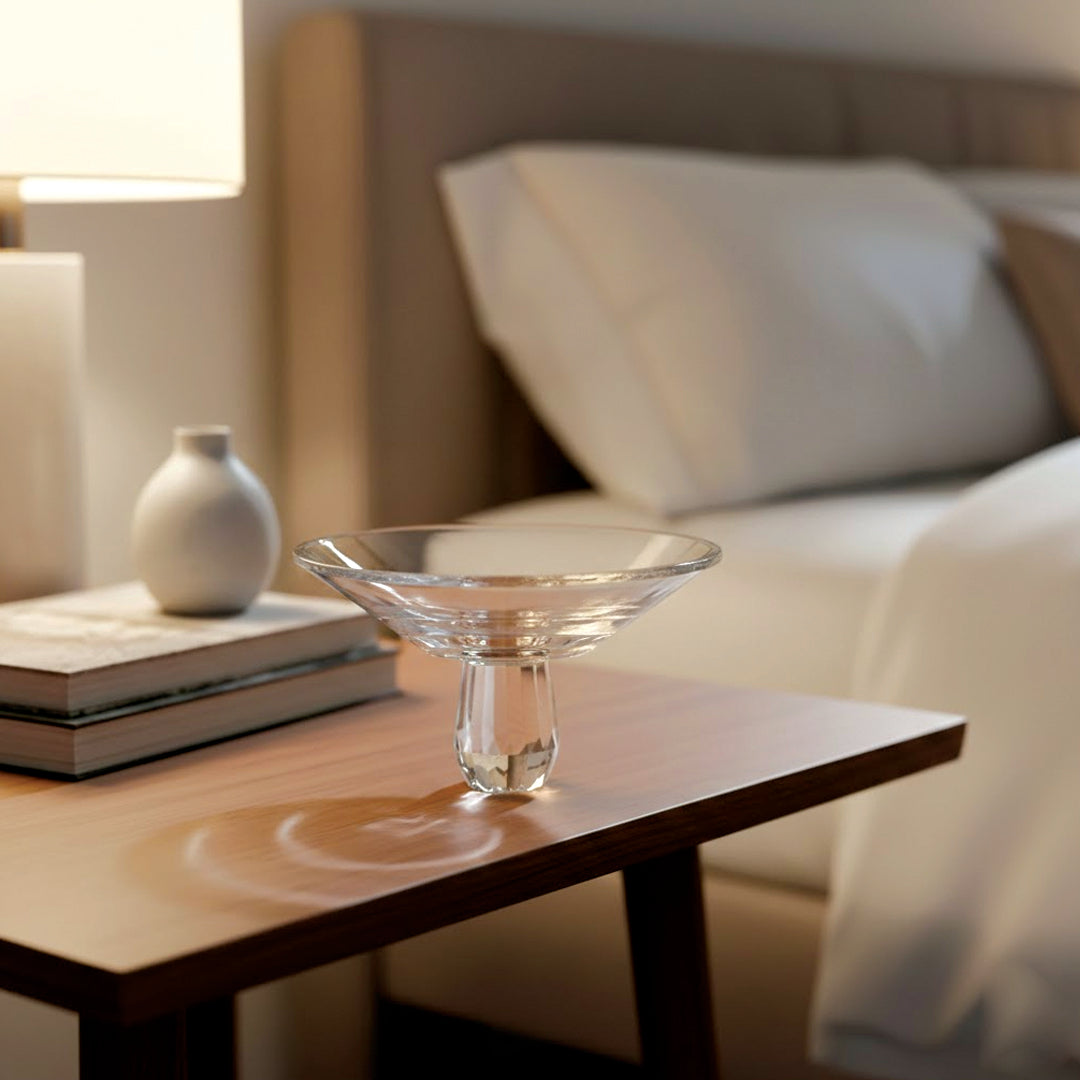 Sleek, clean, and minimal clear glass pedestal bowl designed for modern table styling. The smooth, wide bowl paired with a faceted crystal-like stem creates a refined silhouette that looks elegant in any space, from living room center tables to dining tables, console tables, and office reception counters.