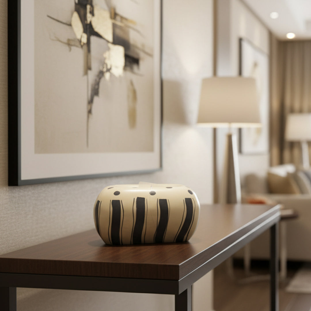 A small white ceramic décor planter with playful stripes. Perfect for adding a fun touch to shelves, desks, or coffee tables.