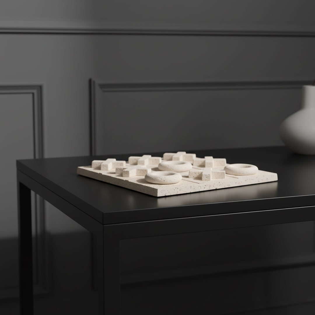 This isn't just a game, it's a stylish piece of decor. This tic-tac-toe set is crafted from a heavy, stone-like material with a clean, sandy texture. It's perfect for leaving out on a coffee table or shelf for a fun and interactive accent piece. Available in two different classic designs.