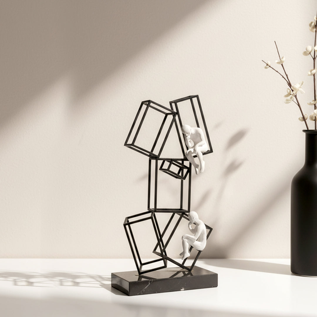 This modern sculpture is a stunning mix of lines and shapes. It features a black metal frame holding a complex arrangement of geometric pieces inside. It's a true conversation starter that adds a cool, architectural vibe to any contemporary space.