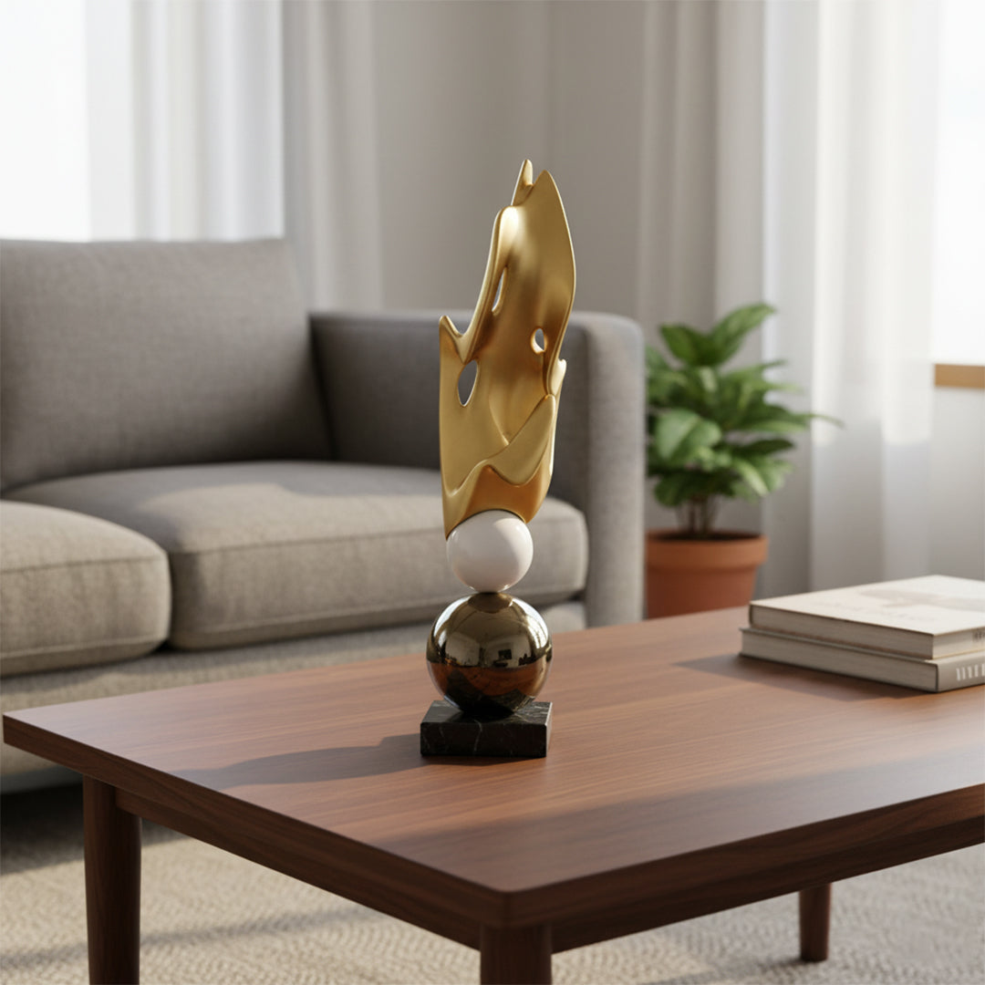 This elegant sculpture brings a touch of class to your home. It features a beautiful golden shape perfectly balanced on a stack of black, white, and gold spheres. It's a simple yet stunning piece for any shelf or table.
