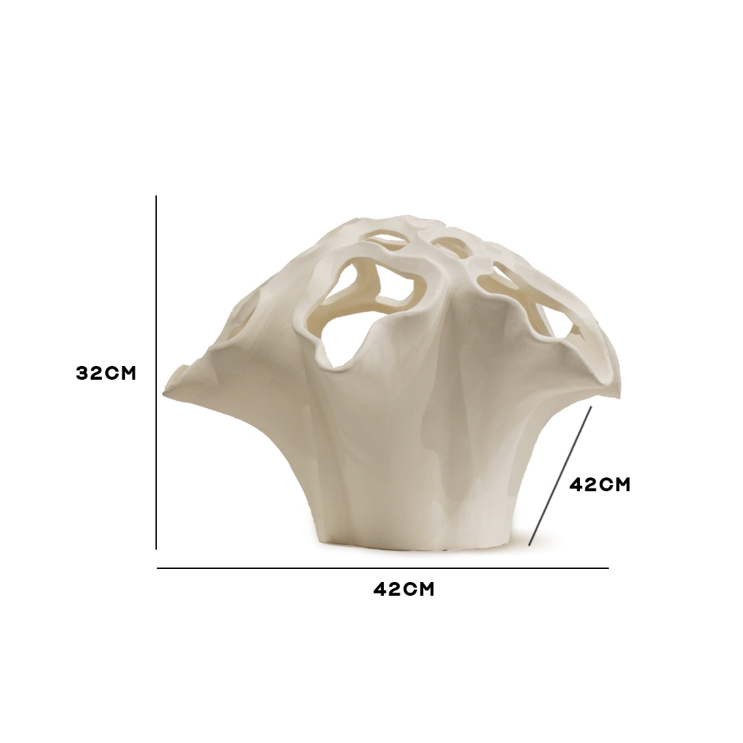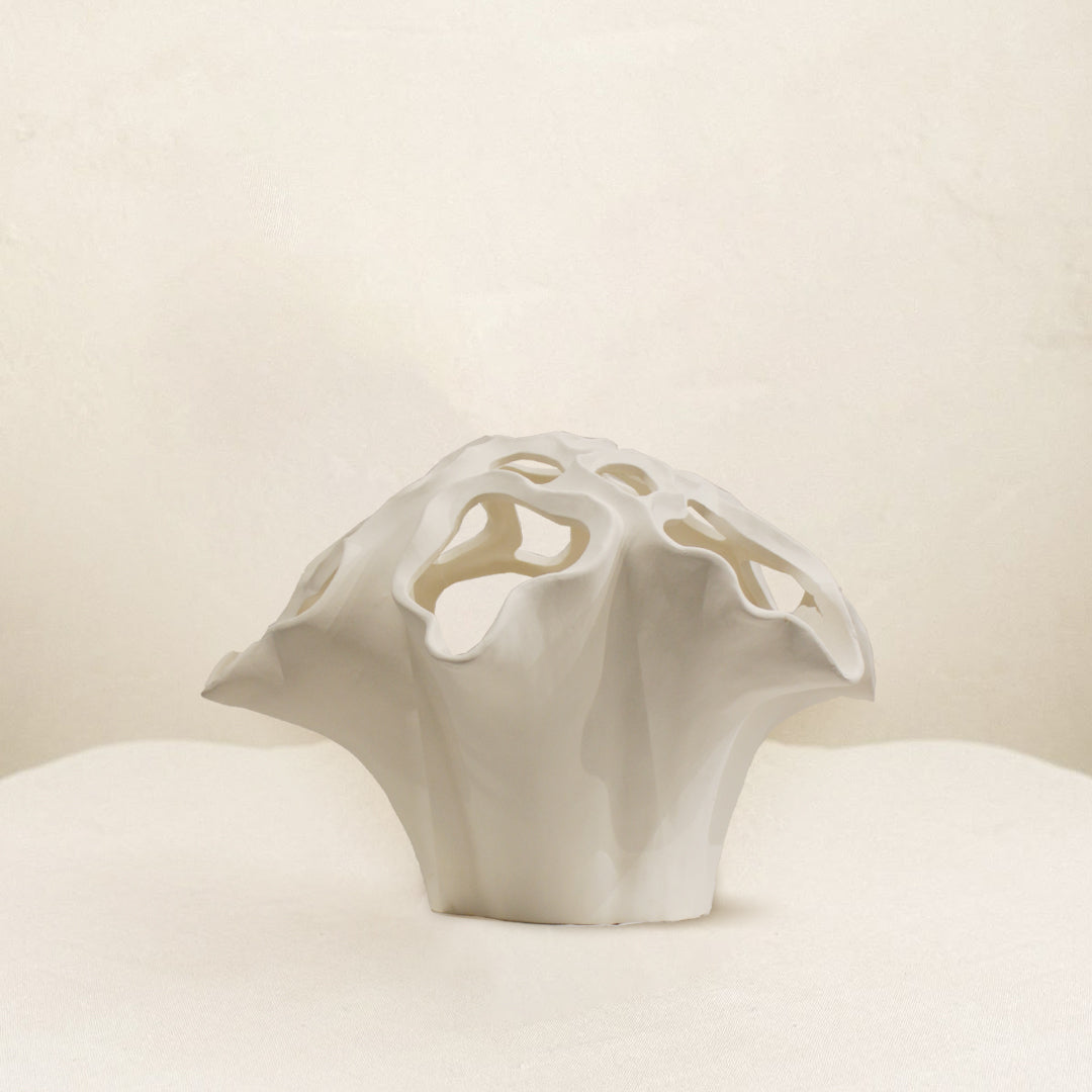 An ethereal and intricate form that seems to defy gravity, the "Cloud Orchid" collection is a masterwork of ceramic art. The rim of each piece explodes into a complex network of delicate, paper-thin ruffles that undulate and fold into one another, creating organic perforations and beautiful negative space. The overall effect is that of a rare, complex orchid or a soft, billowing cloud. Finished in a smooth, satin-white, this centerpiece is designed to be mesmerizing & showcase the absolute limit of the potter's craft.Ityadi Decor's designer vase: a masterpiece of craftsmanship and style, perfect for showcasing floral arrangements or standing alone as a statement piece.