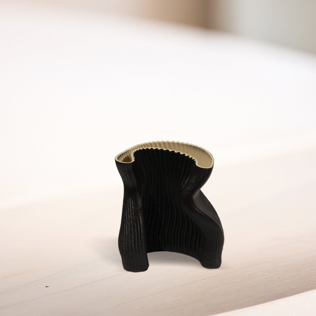 A sophisticated piece of wearable art for the home, the "Pleated Bodice" vase is a study in texture, form, and contrast. Its sensuous, figural shape is wrapped in a skin of fine, vertical pleats, finished in a deep, textured black that absorbs the light. This dramatic exterior gives way to a stunning surprise within: a creamy white interior with a delicate, scalloped rim that provides a crisp, elegant counterpoint. This vase is a dialogue between light and shadow, hard and soft, making it an unforgettable accent for a modern, fashion-forward space.