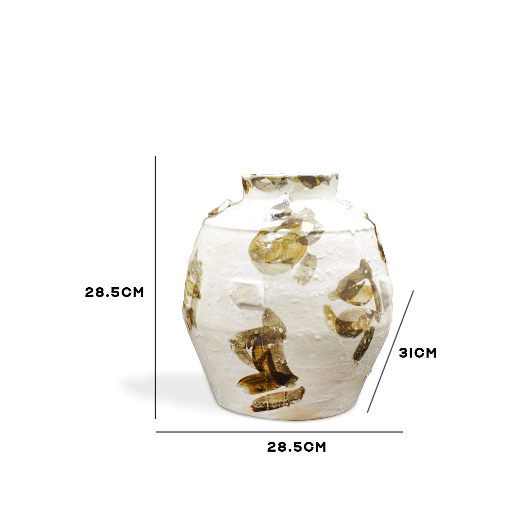 Embodying the Japanese aesthetic of wabi-sabi, this vase celebrates the beauty of imperfection and the artisan's touch. The vessel has a robust, ancient form, covered in a heavily textured, antique white finish that feels like raw plaster or stone. Its surface is a canvas for expressive, abstract brushstrokes in earthy browns and blacks, giving it the character of a cherished archaeological find. This piece is not just a vase but a soulful object, perfect for bringing a sense of history and groundedness to your space.