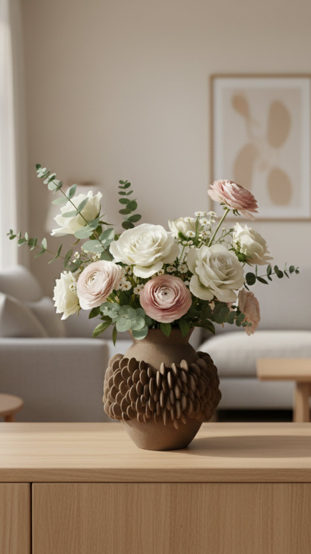 Drawing inspiration from the beautiful, protective armor of the pangolin, this pottery collection is a tribute to natural textures. Each piece features a wide band of overlapping, hand-applied clay discs that create a stunning scaled effect. The rich, sandy brown finish enhances the tactile quality, making you want to reach out and touch it.