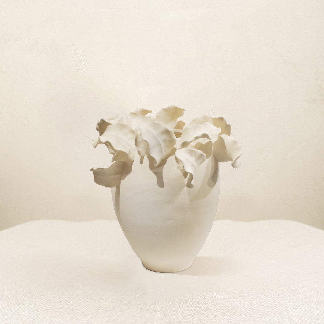An exuberant celebration of botanical beauty, the "Magnolia Bloom" collection is designed to captivate. Each piece features a simple, elegant body with a soft, unglazed bisque finish. The true artistry is found at the rim, which explodes into a breathtaking crown of large, individually hand-sculpted petals, reminiscent of a magnolia flower in full bloom. The interplay of the smooth vessel and the richly detailed, undulating petals creates a dynamic sense of life and movement. These are true statement pieces, perfect as standalone sculptures or for holding dramatic arrangements.Ityadi Decor's designer vase: a masterpiece of craftsmanship and style, perfect for showcasing floral arrangements or standing alone as a statement piece