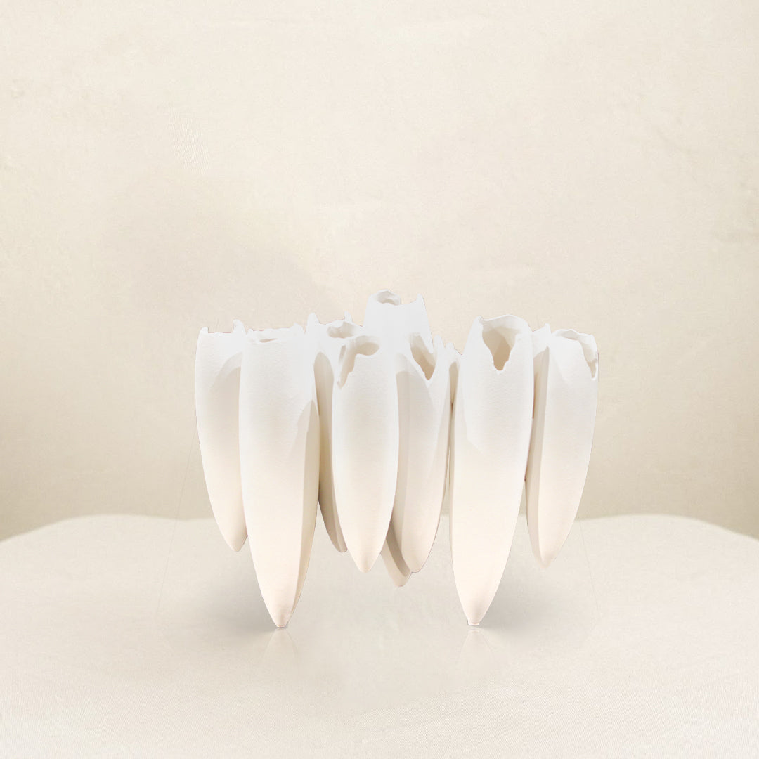 A breathtaking work of modern sculpture, the "Tusk Cluster" vase is both elegant and wild. The piece is composed of a cluster of smooth, elongated, tusk-like forms that rise organically from a single, stable base. Each tusk is a hollow vessel, creating a unique multi-opening vase perfect for minimalist ikebana-style arrangements or for display as a standalone art object. The pure, matte white finish enhances its striking silhouette, making it an unforgettable centerpiece in any contemporary space.Ityadi Decor's designer vase: a masterpiece of craftsmanship and style, perfect for showcasing floral arrangements or standing alone as a statement piece.