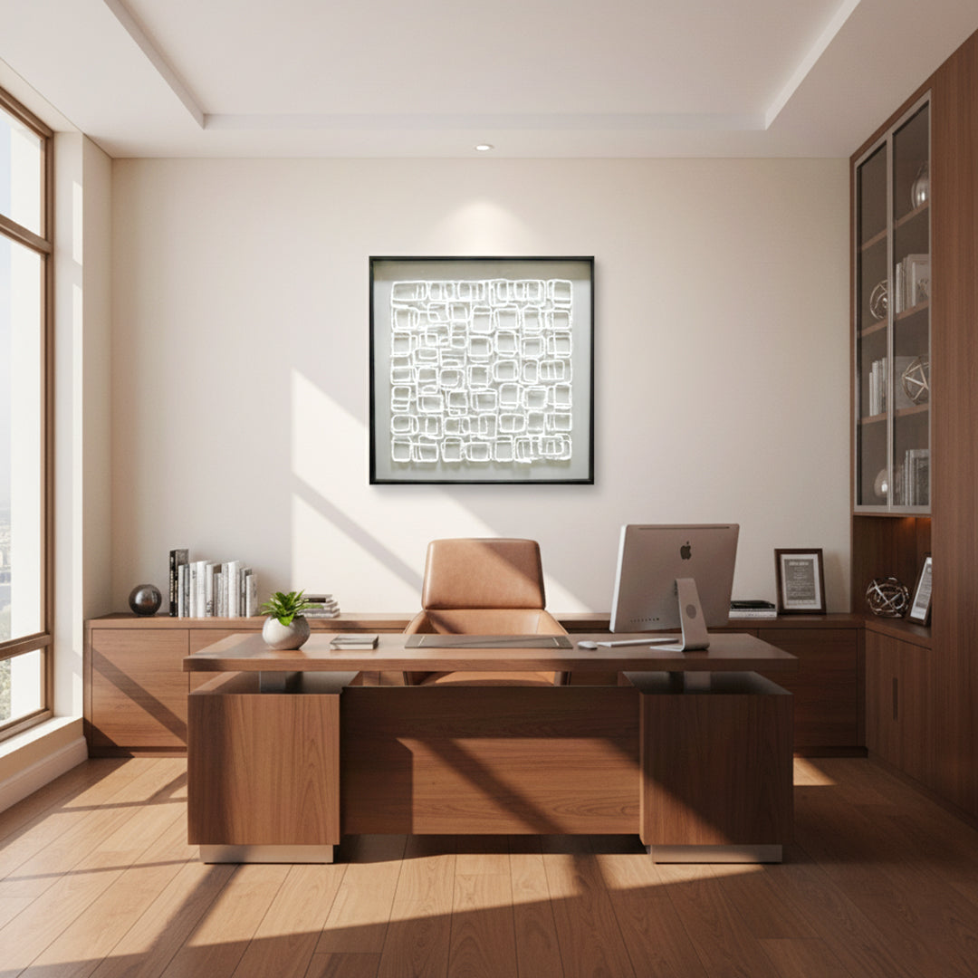 The Abstract wall art is a perfect artistic focal point for a professional office decor setting or a refined contemporary living space, enhancing any wall art collection.