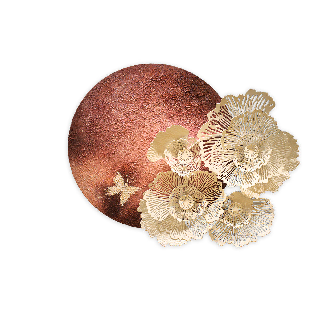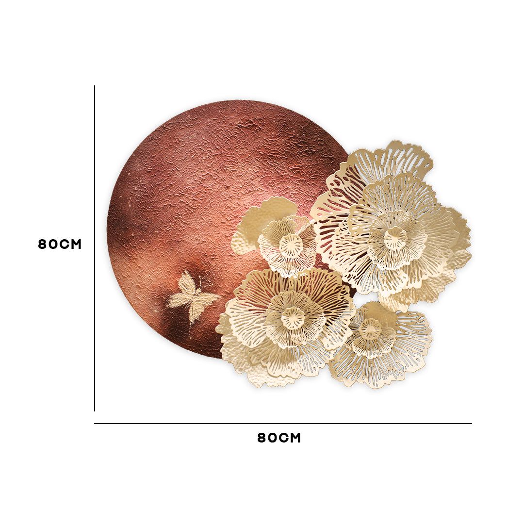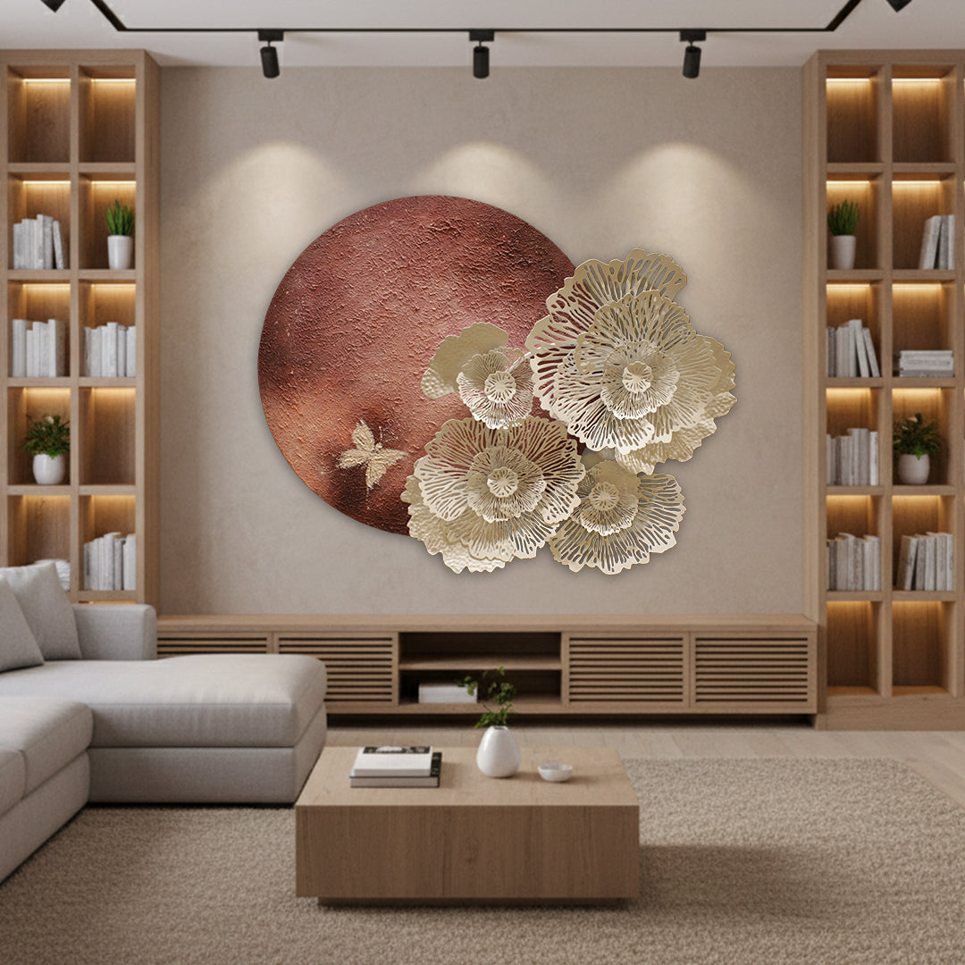 The Opulent Bloom Wall Sculpture pairs a large, textured piece with intricate, layered gold metal flowers and a delicate butterfly. This 3D piece instantly transforms a wall into a high-end focal point, bringing rich color, depth, and opulent organic elegance to your modern living room or grand entryway.