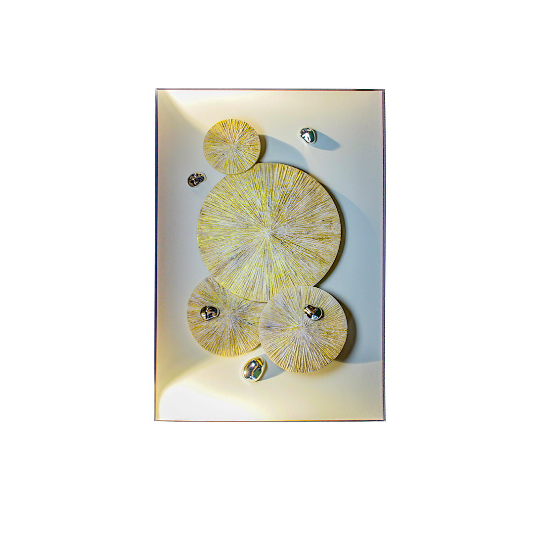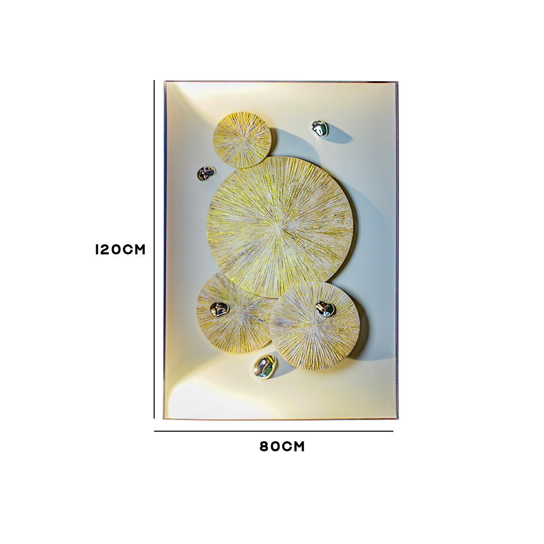 This Modern Abstract Disc Art features layered, sunburst-textured circles of pale fiber, accented by polished metallic pebbles. The crisp, framed design and subtle shimmer create a sophisticated, multidimensional focal point that perfectly blends natural texture with contemporary luxury.